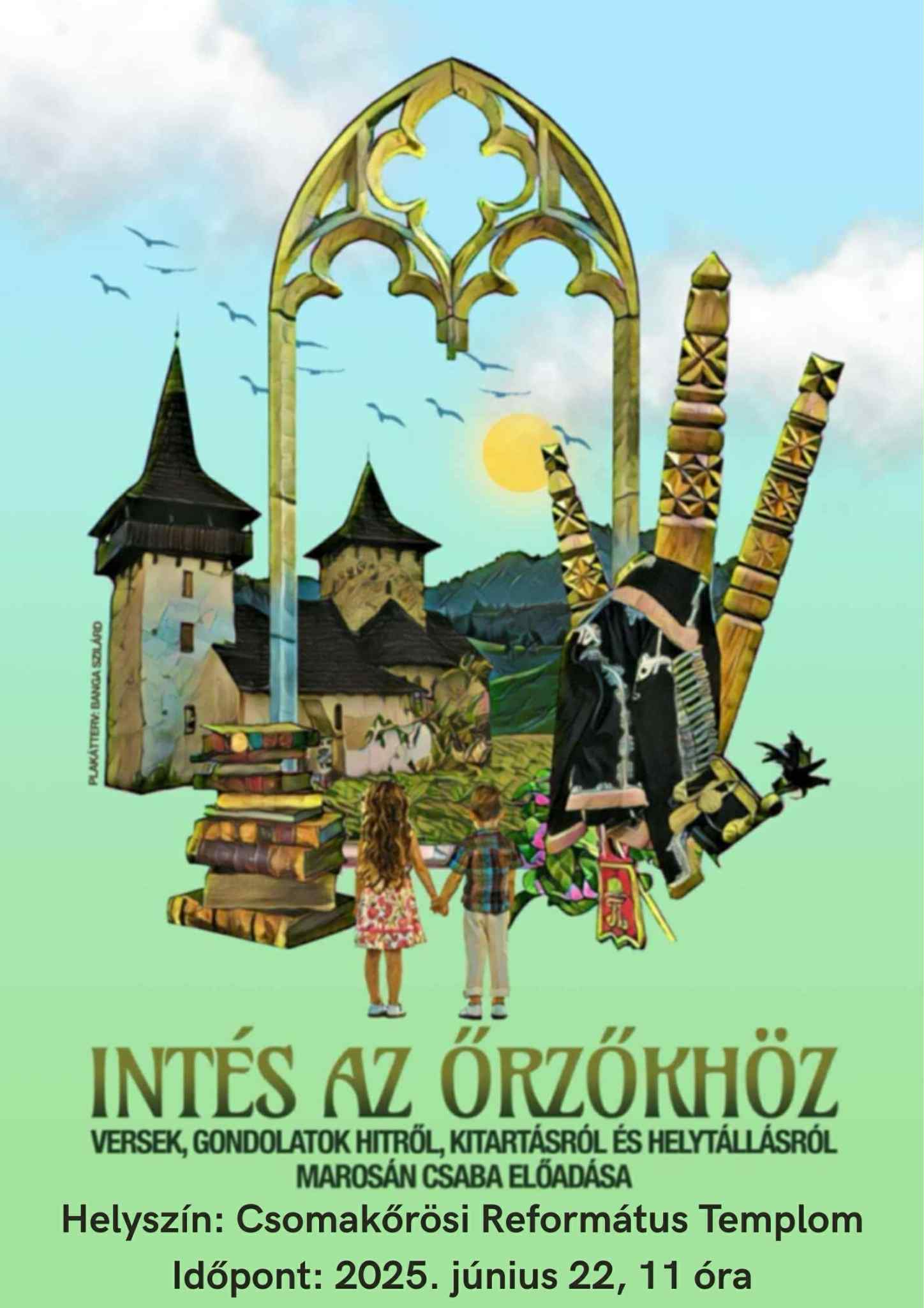 Szeretettel hívunk és várunk mindenkit 2025. június 22-én, vasárnap, 11 órai kezdettel a Csomakőrösi Református Templomba, ahol Marosán Csaba, a Kolozsvári Állami Magyar Színtársulat színészének Intés az őrzőkhöz című előadásán vehetünk részt. Az előadás rövid összefoglalója: “Az Adytól kölcsönzött Intés az őrzőkhöz című előadás gerincét olyan különböző korú, stílusú és hangulatú versek alkotják, melyek szólnak a hazáról, hitről, kitartásról és helytállásról. Ady, Radnóti, Petőfi és Dsida azon versei hangzanak el az előadásban, melyek időtálló üzeneteket tartalmaznak.”