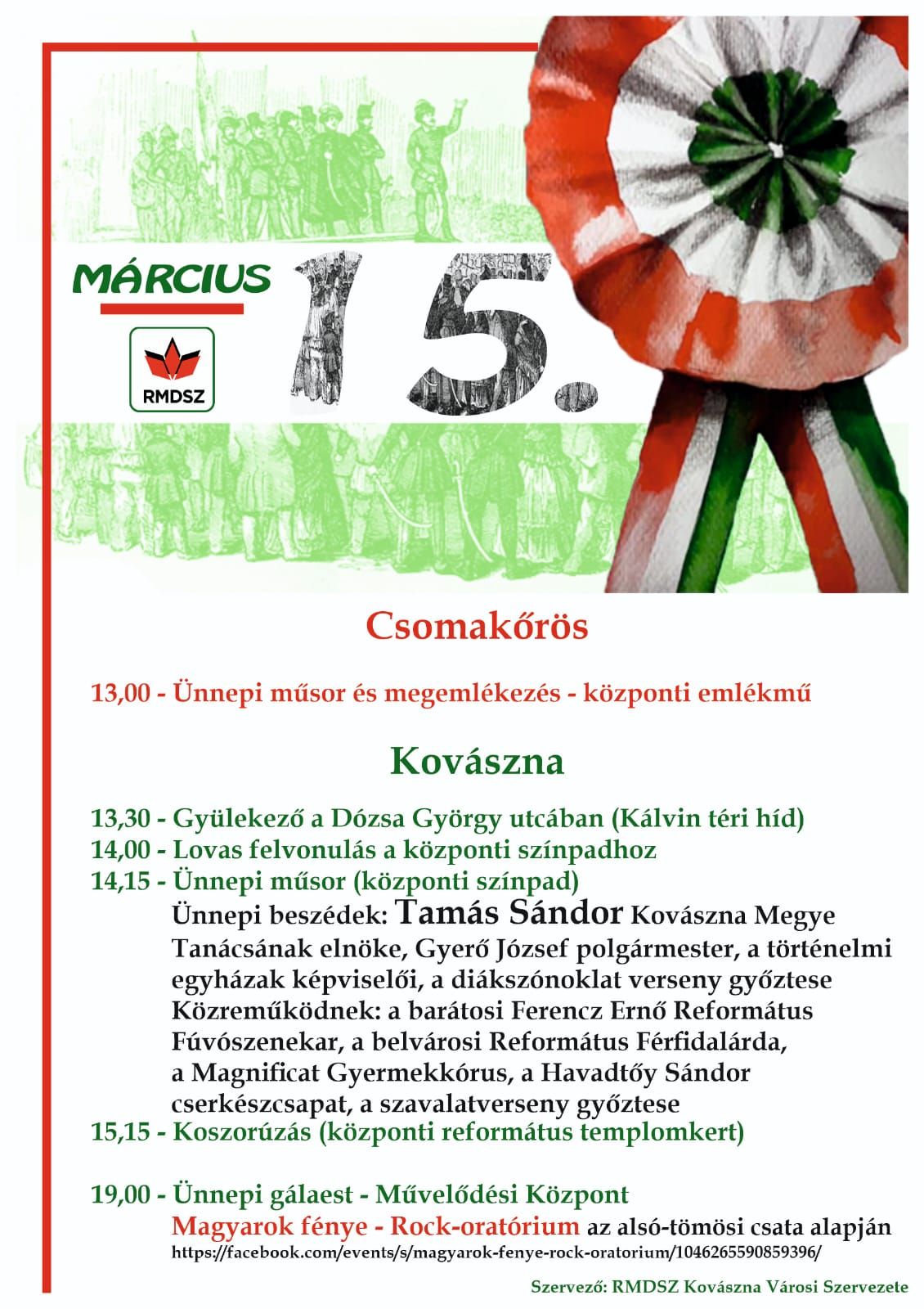 Ünnepi beszédek: Tamás Sándor Kovászna Megye Tanácsának elnöke, Gyerő József polgármester, a történelmi egyházak képviselői, a diákszónoklat verseny győztese Közreműködnek: a barátosi Ferencz Ernő Református Fúvószenekar, a belvárosi Református Férfidalárda, a Magnificat Gyermekkórus, a Havadtőy Sándor cserkészcsapat, a szavalatverseny győztese