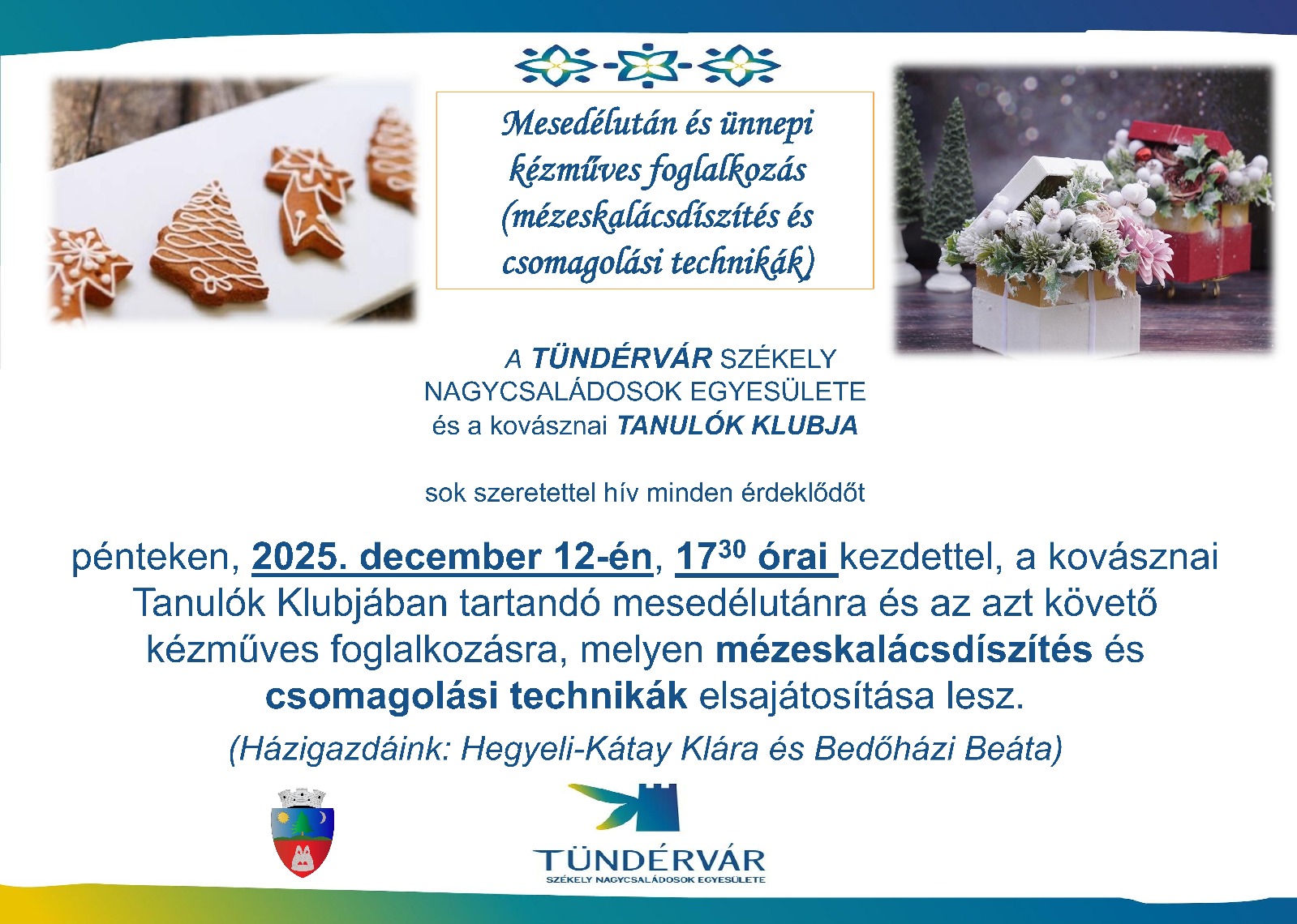 | A TÜNDÉRVÁR SZÉKELY NAGYCSALÁDOSOK EGYESÜLETE és a kovásznai TANULÓK KLUBJA sok szeretettel hív minden érdeklődőt pénteken, 2025. december 12-én, 17:30 órai kezdettel, a kovásznai Tanulók Klubjában tartandó mesedélutánra és az azt követő kézműves foglalkozásra, melyen mézeskalácsdíszítés és csomagolási technikák elsajátosítása lesz. Házigazdáink: Hegyeli-Kátay Klára és Bedőházi Beáta |