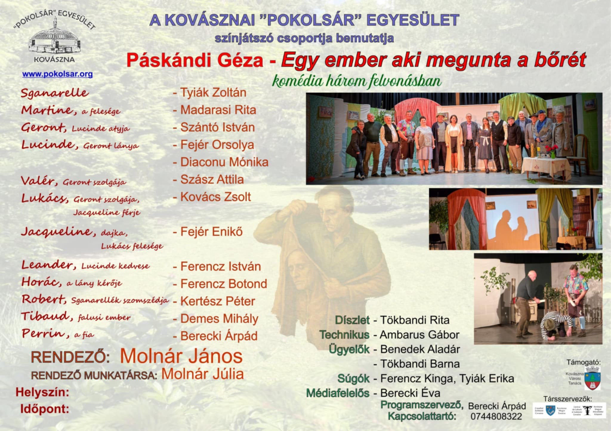 2025. július 11-én, pénteken 19,00 órai kezdettel a Kovásznai Művelődési Központban a kovásznai “Pokolsár” Egyesület Színjátszó csoportja bemutatja Páskándi Géza: Egy ember, aki megunta a bőrét című háromfelvonásos komédiáját.