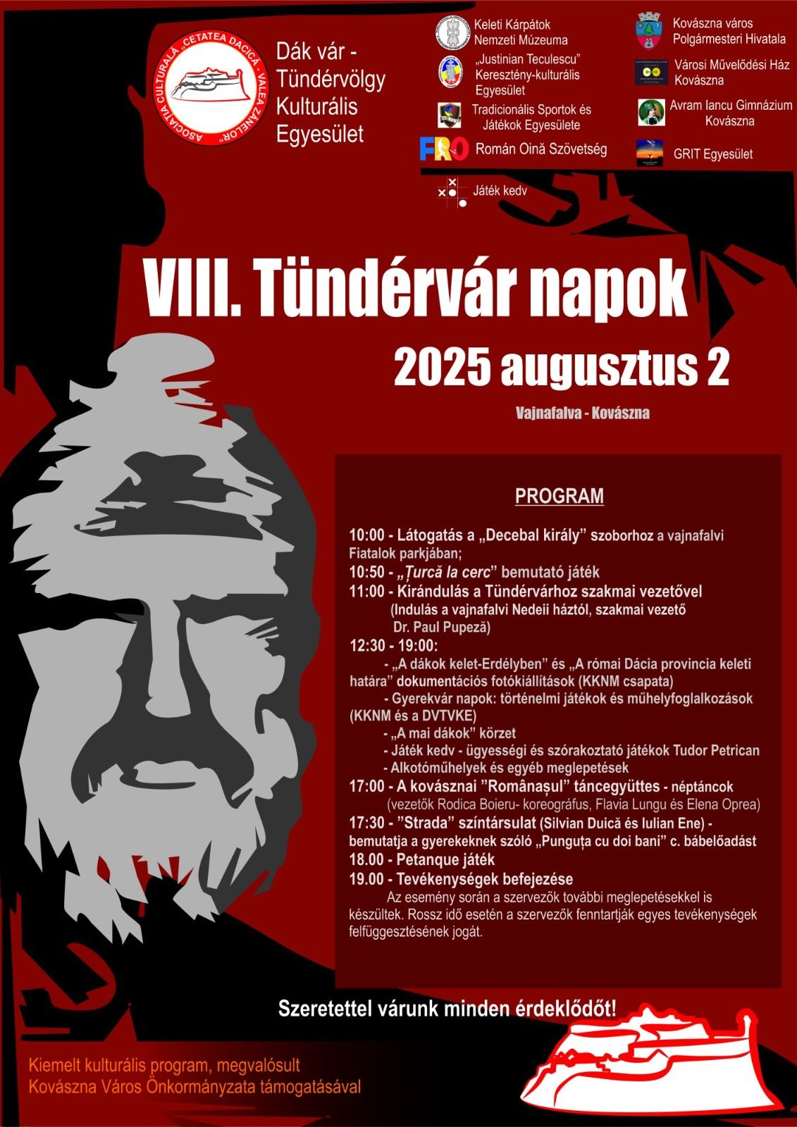 2025. AUGUSZTUS 2-ÁN, SZOMBATON Kovásznán a Tündérvölgyben kerül sor a VIII. Tündérvár napokra. Az esemény változatos programokat kínál: lesznek foglalkozások és műhelyek gyerekeknek, szabadtéri tudományos konferencia, szervezett túra a Tündérvárrégészeti lelőhelyhez az ott dolgozó archeológusok vezetésével, stb.