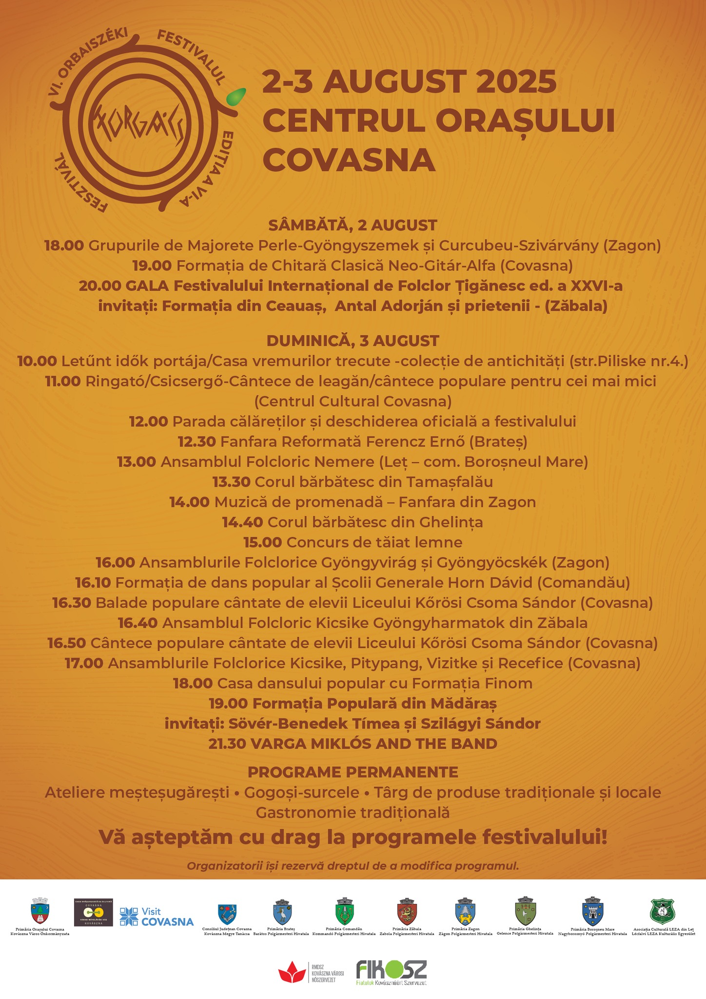 Organizatori/Parteneri: Primăria Oraşului Covasna, Casa Orăşenească de Cultură Covasna, Asociaţia Pentru Dezvoltarea Turismului în Judeţul Covasna, Consiliul Judeţean Covasna,