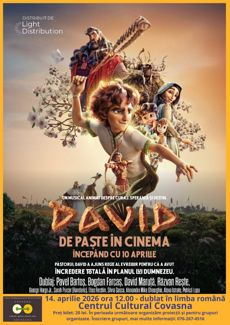 Vă așteptăm cu drag la proiecția filmului DAVID, un FILM DE ANIMAȚIE PENTRU TOATĂ FAMILIA – CU OCAZIA SĂRBĂTORII PAȘTELUI.